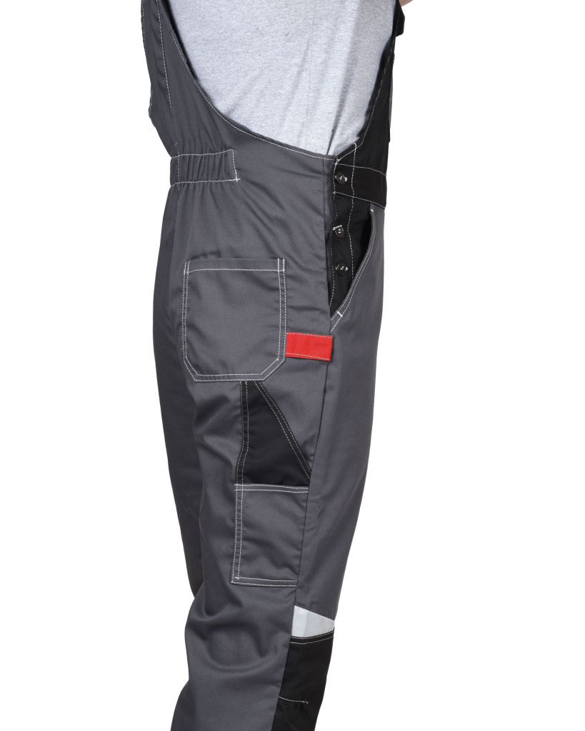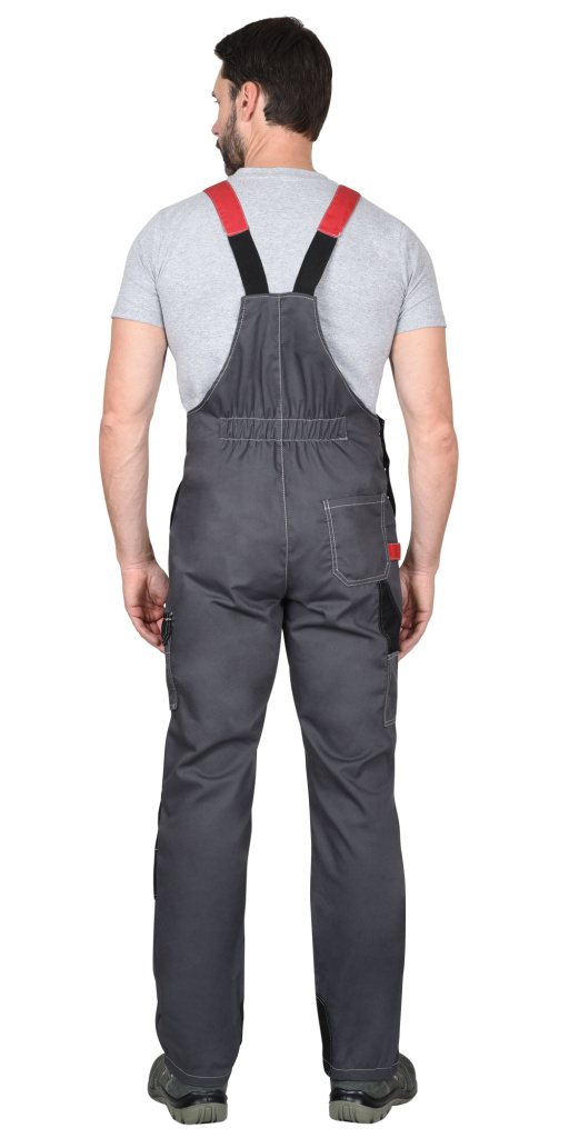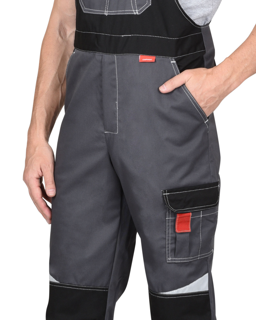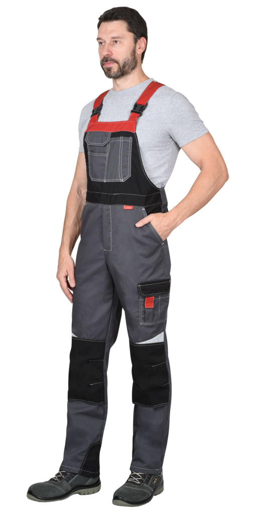 Полукомбинезон с застёжкой гульфика на молнию и застёжкой в боковом шве на пуговицы; с различными многофункциональными карманами; с объемными наколенниками.