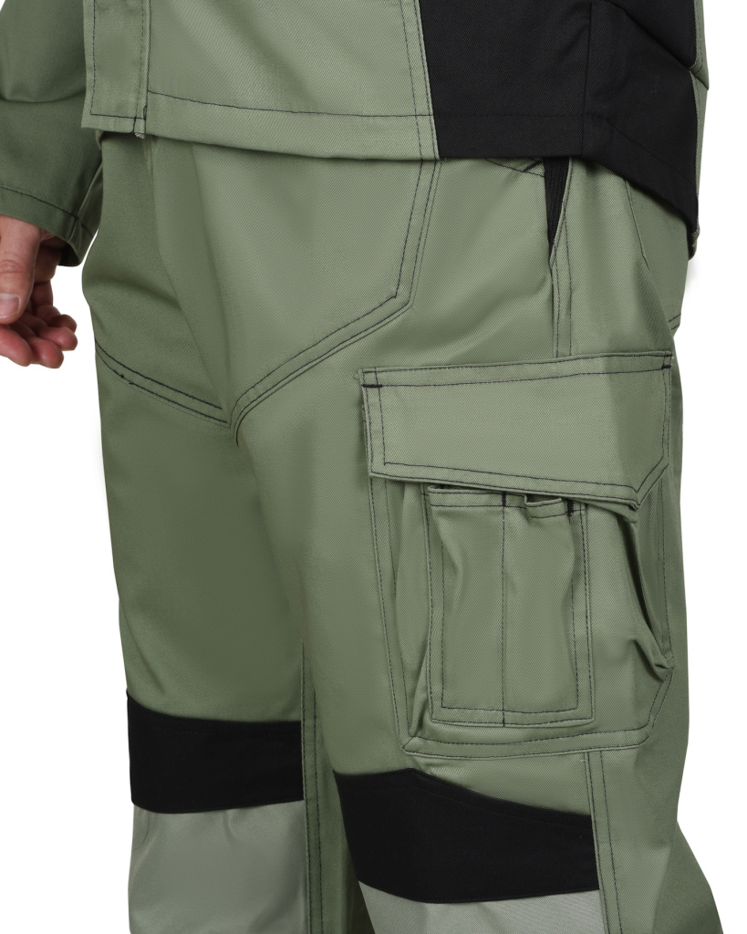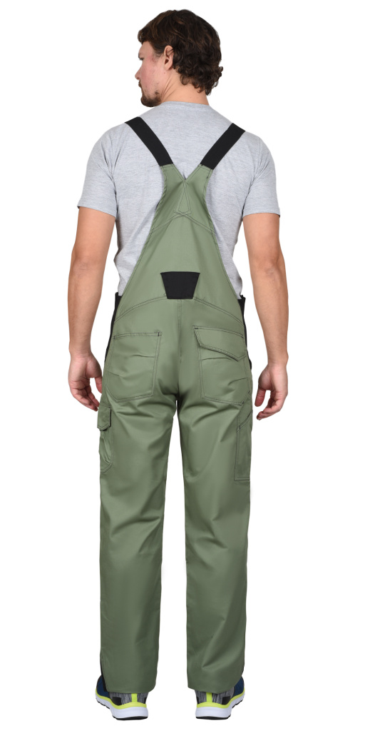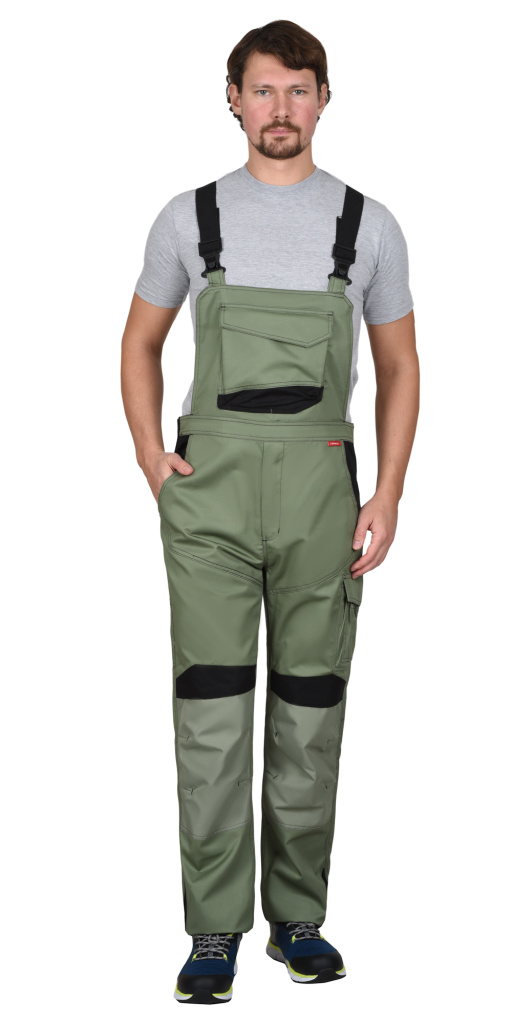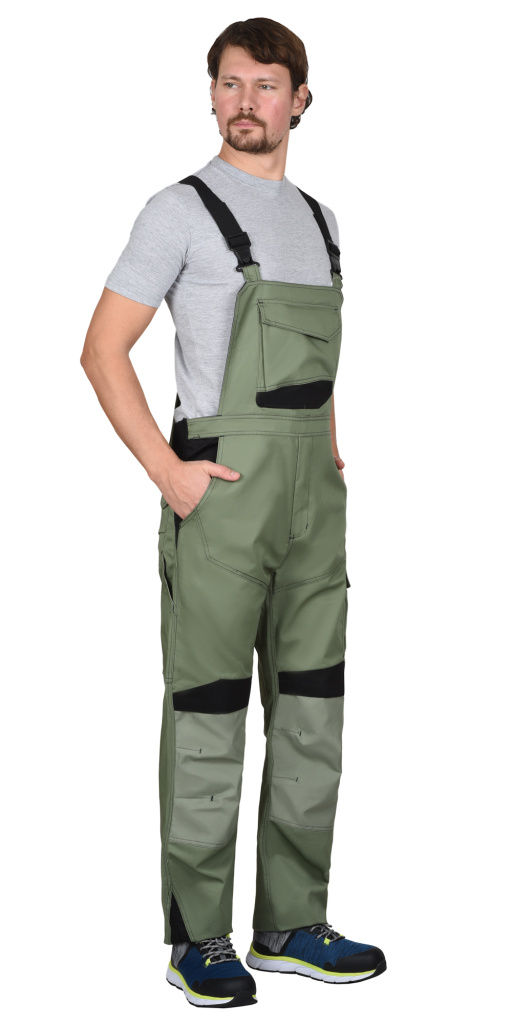 Полукомбинезон прямой с застёжкой спереди - гульфик с молнией, с отрезной грудкой, отрезной спинкой, с бретелями. В боковом шве полукомбинезона со стороны задней половинки вставка из эластичного материала для удобства использования. Полукомбинезон с карманами спереди, сзади и на боковых швах, с объёмными наколенниками из полиэфирной, плотной, непромокаемой ткани с верхним входом для амортизационного вкладыша. Бретели регулируются по длине.