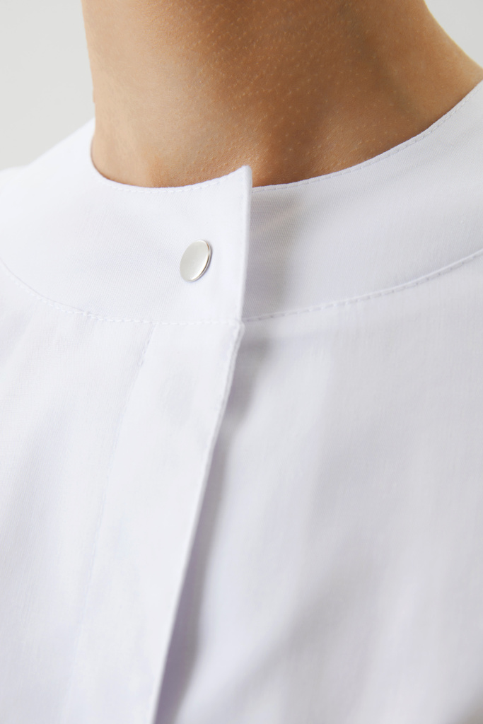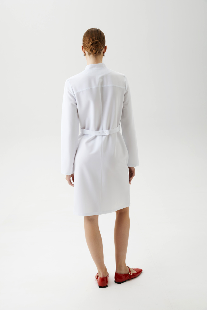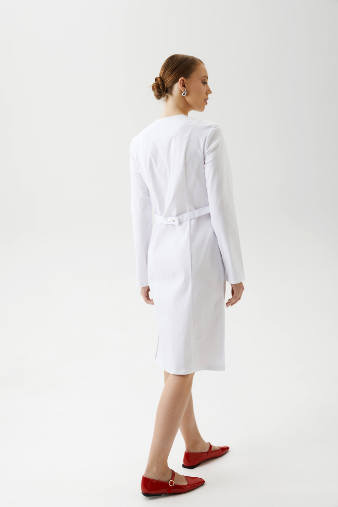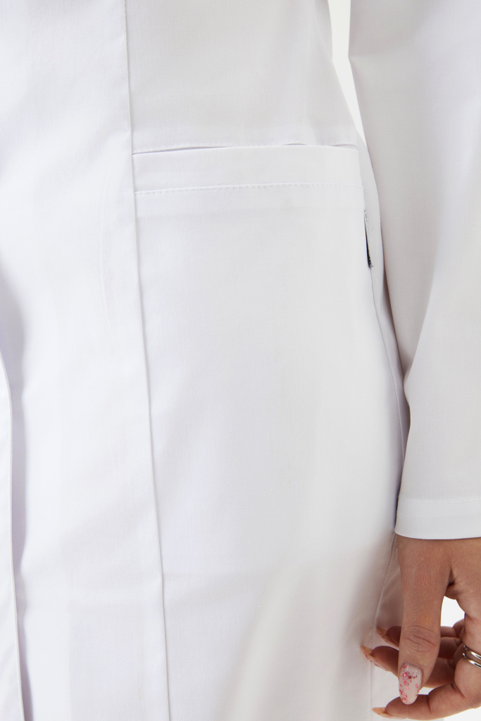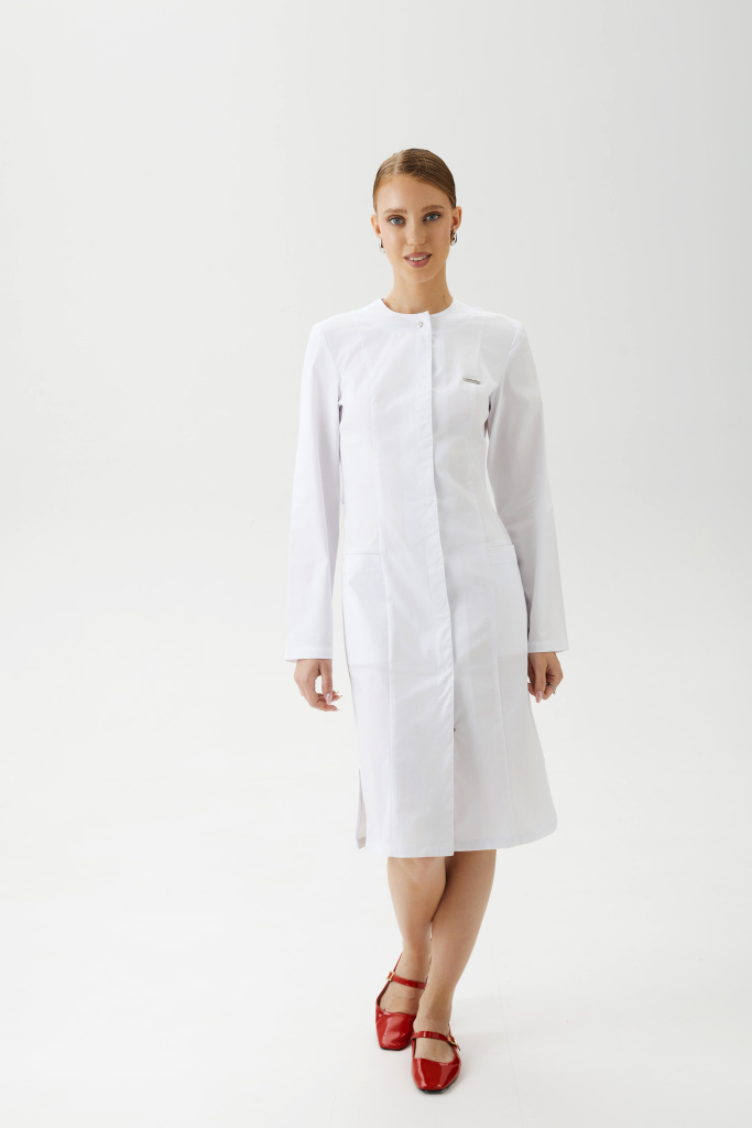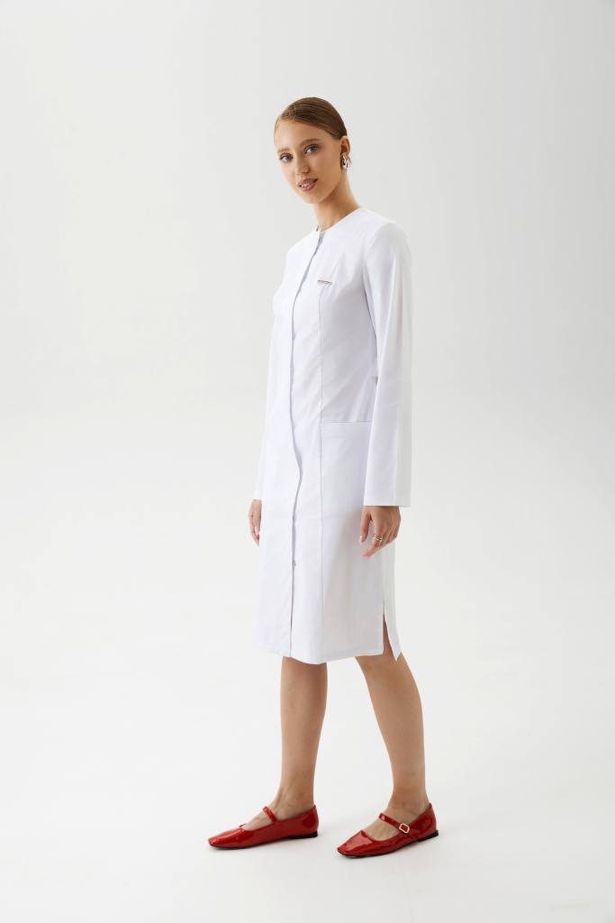 Халат женский, полуприлегающего силуэта с центральной бортовой застежкой на потайные металлические кнопки и разрезами в боковых швах. Полочка с рельефами, выходящими из плечевых швов до низа изделия. На боковой части полочки боковые карманы с планкой . На левой боковой части полочки декоративная нашивка. Спинка с рельефами, выходящими из плечевых швов до низа изделия. Горловина с планками. Рукава — втачные, одношовные