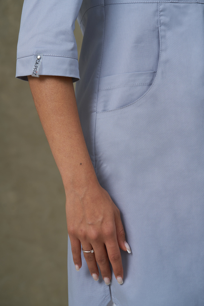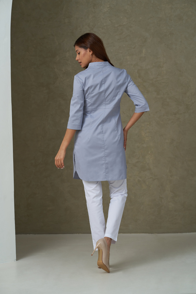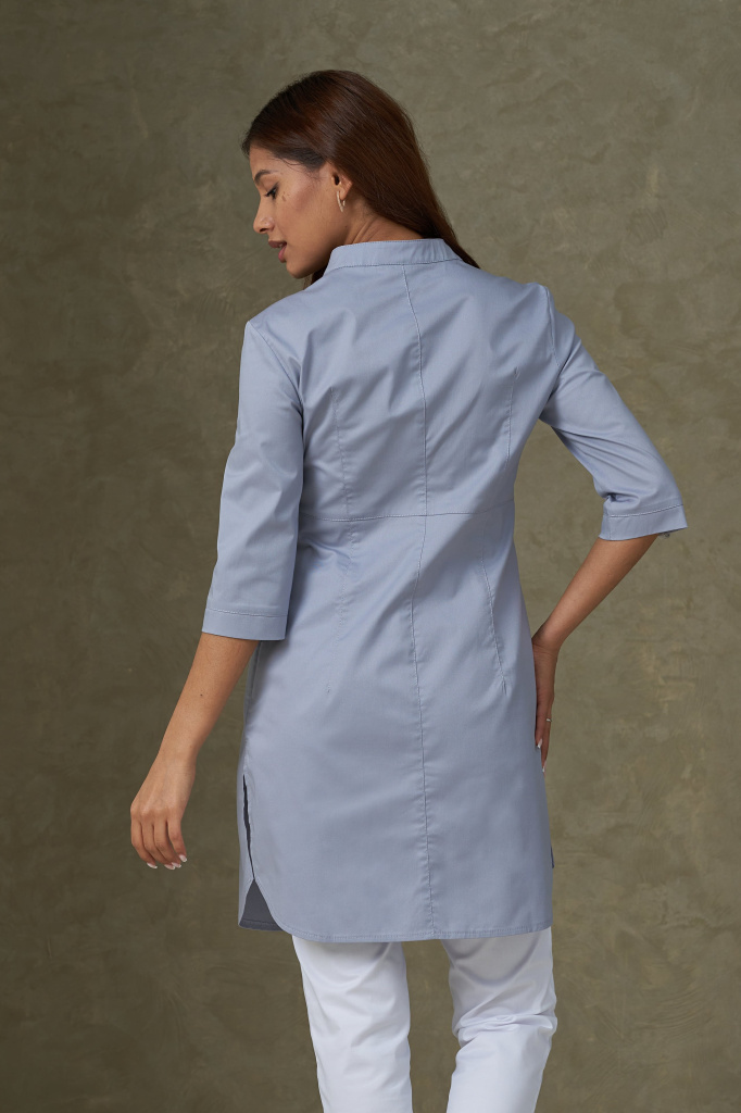 Куртка женская, медицинская, хирургическая, удлинённая полуприлегающего силуэта, отрезная по линии талии, воротник стойка. Перед с отрезной планкой, застегивающейся на 7 кнопок, боковыми карманами, расположенными в фигурных швах полочек, и малым правым карманом. От линии талии по две вытачки. На левой полочке нагрудный карман с притачной планкой. Спинка со средним швом и талиевыми вытачками. Рукава втачные, одношовные.