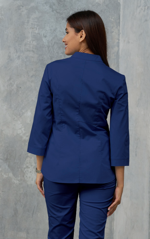 Куртка женская, медицинская, хирургическая, полуприлегающего силуэта, отрезная по линии талии, воротник стойка. Перед с отрезной планкой, застегивающейся на 6 кнопок, боковыми карманами, расположенными в фигурных швах полочек, и малым правым карманом. От линии талии по две вытачки. На левой полочке нагрудный карман с притачной планкой. Спинка со средним швом и талиевыми вытачками. Рукава втачные, одношовные, имеют две длинны :короткий, с притачной манжетой и рукав ¾ с притачной манжетой Куртка выпускается в комплекте с брюками, допускается изготовление отдельными предметами.