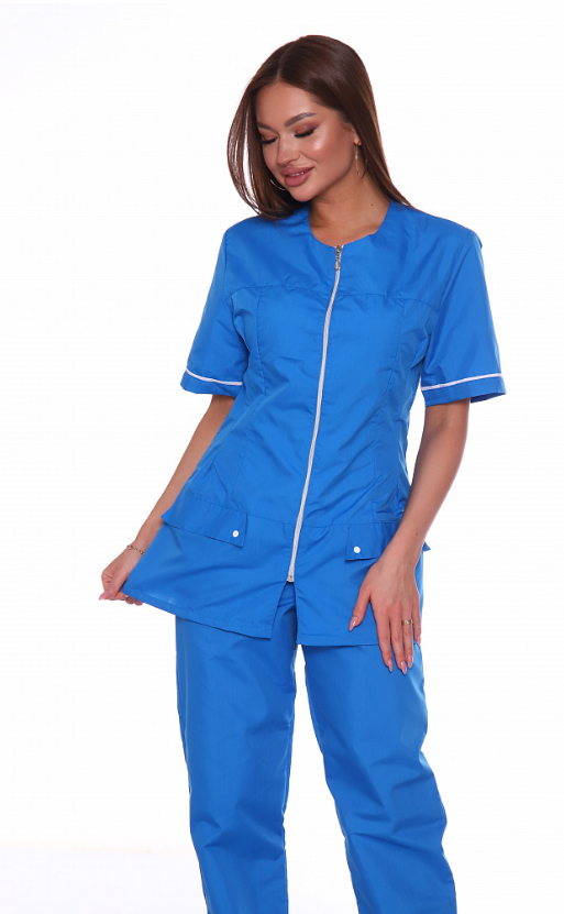 Современный косюм на молния состоит из брюк на поясе резинка и блузы.