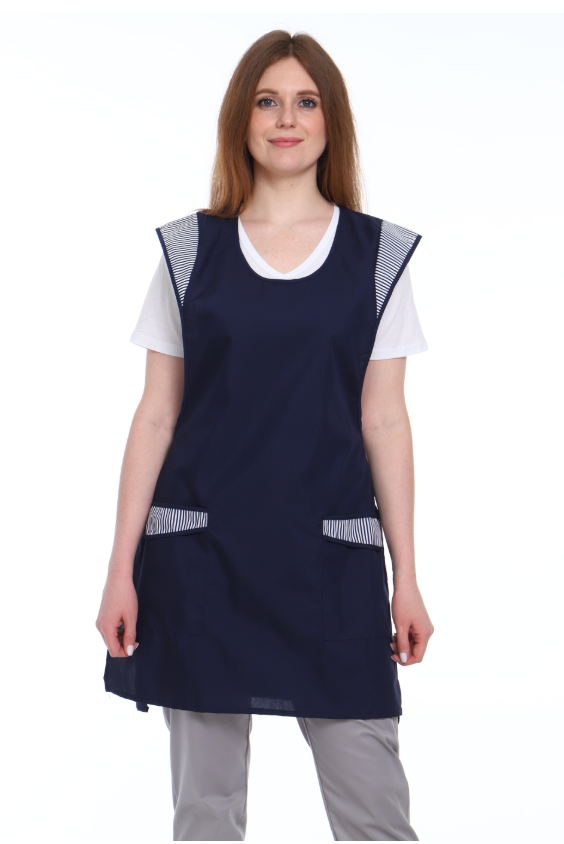 Фартук перекидной, имеющий спинку без отделки и полочку . В нижней части полочки расположены вместительные карманы. Объем талии фартука регулируется завязками-поясами, все срезы фартука обработаны кантом из контрастной капроновой ткани. Фартук предназначен для защиты от общепроизводственных загрязнений.