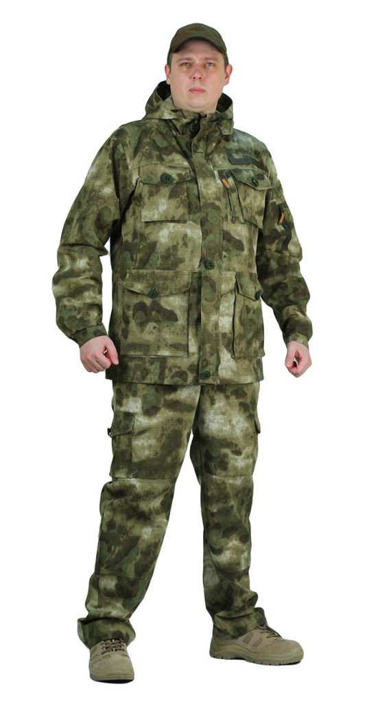 Костюм состоит из куртки и брюк - Куртка прямая, с центральной застежкой на молнию и ветрозащитным клапаном на пуговицах канадках - Цельнокрайний капюшон регулирующийся по лицевой части лентой и на затылке липучкой и резинкой - На левой полочке расположена липучка для шеврона, прорезной вертикальный карман на молнии - Верхние и нижние накладные объёмные карманы с клапанами, застёгивающиеся на пуговицах канадках - Рукава прямые с манжетами на пуговицах канадка - На левом рукаве расположен накладной карман со входом на молнию - Складки на спинке куртки, придающие свободу движения - Брюки прямые свободные, на поясе с резинкой и шлёвками, регулируются по низу по ширине - Застежка-гульфик на молнии и пуговице канадке - Боковые карманы на передних половинках и накладные объёмные карманы с клапанами, застёгивающиеся на пуговицах канадках - Усилительная накладка в области задней части брюк